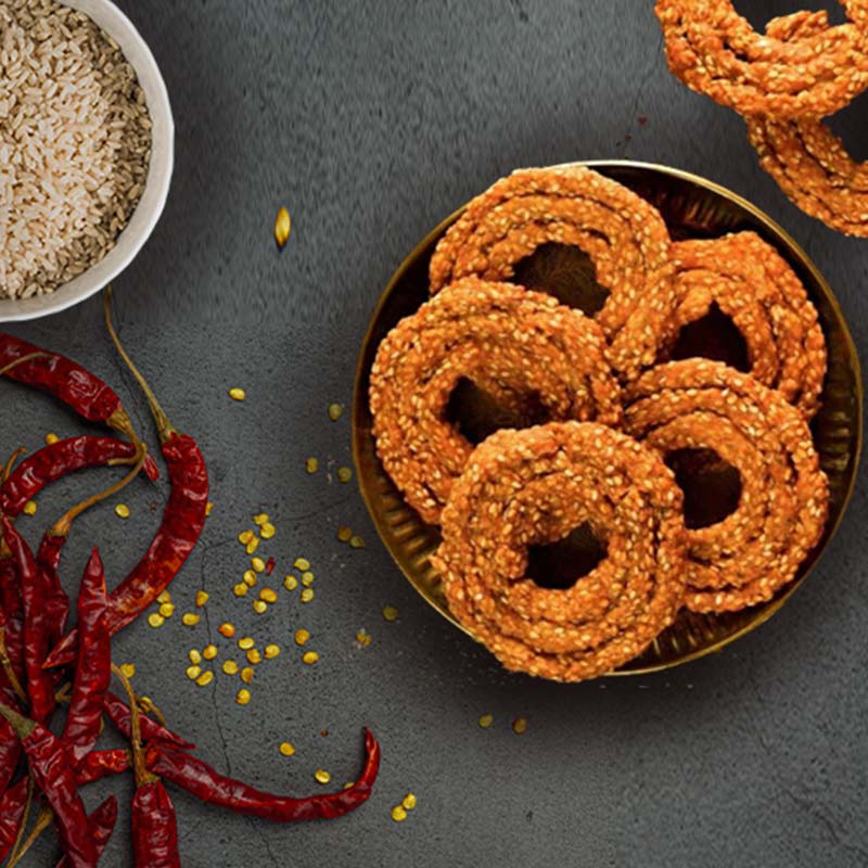 This traditional Indian snack takes a fiery twist with the addition of red chili powder, making every bite an exciting flavor adventure. The crunchy swirls are carefully crafted with rice flour, sesame seeds, carom seeds, cumin, salt, and sunflower oil, bringing together a delightful snack that is both robust in flavor and deeply rooted in tradition. Enjoy it with a hot cup of tea or coffee for the perfect evening snack